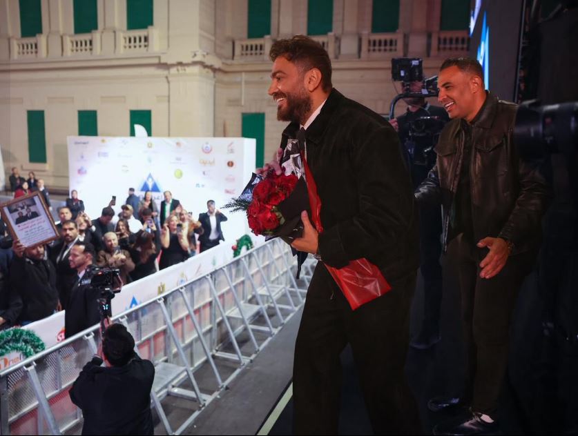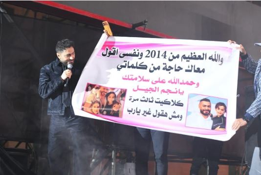 وفاجأ الجمهور تامر حسني فور صعوده على المسرح، حيث استُقبل بحفاوة بالغة، وتوافدت عليه باقات الورود واللافتات المتنوعة تعبيرًا عن الاحتفال بشفائه.