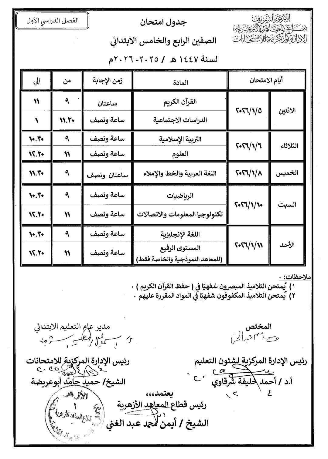 جدول امتحانات الصف الرابع الابتدائي ازهر 2026
