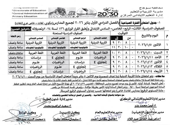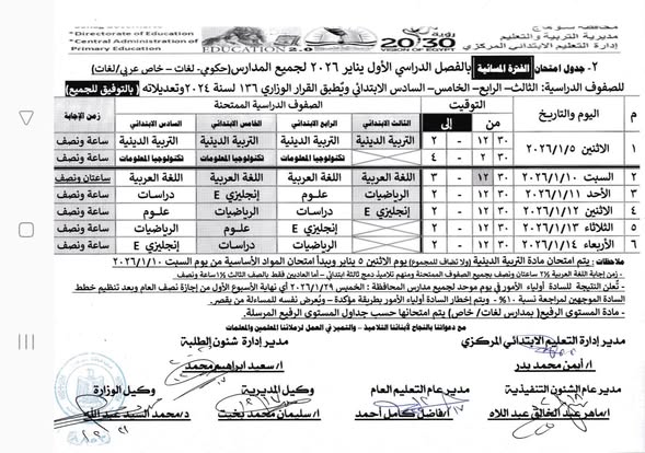 جداول امتحانات الفصل الدراسى الأول 2026 بسوهاج المرحلة الابتدائية