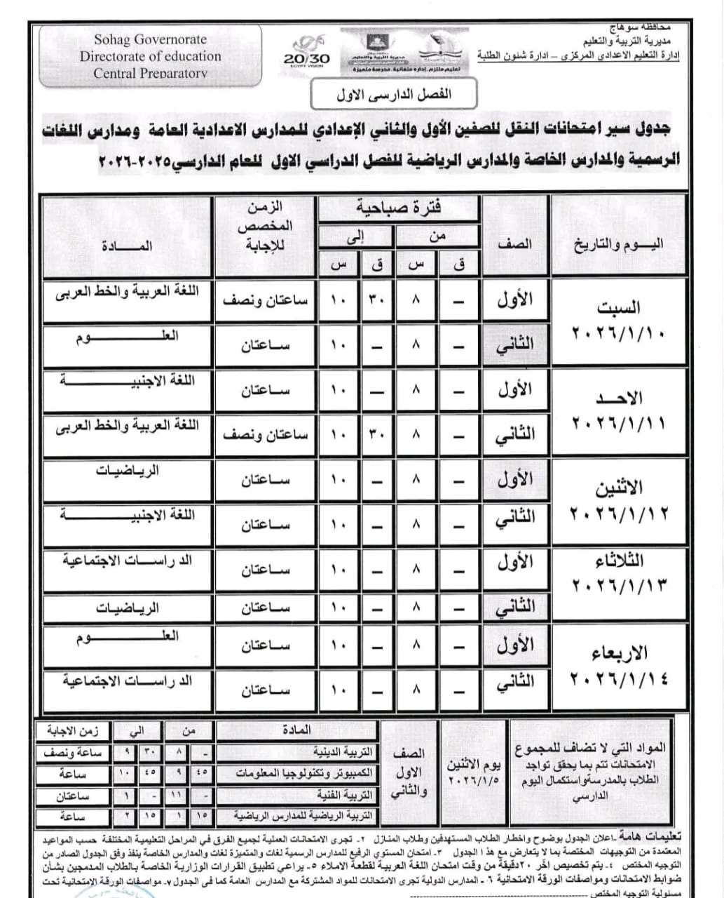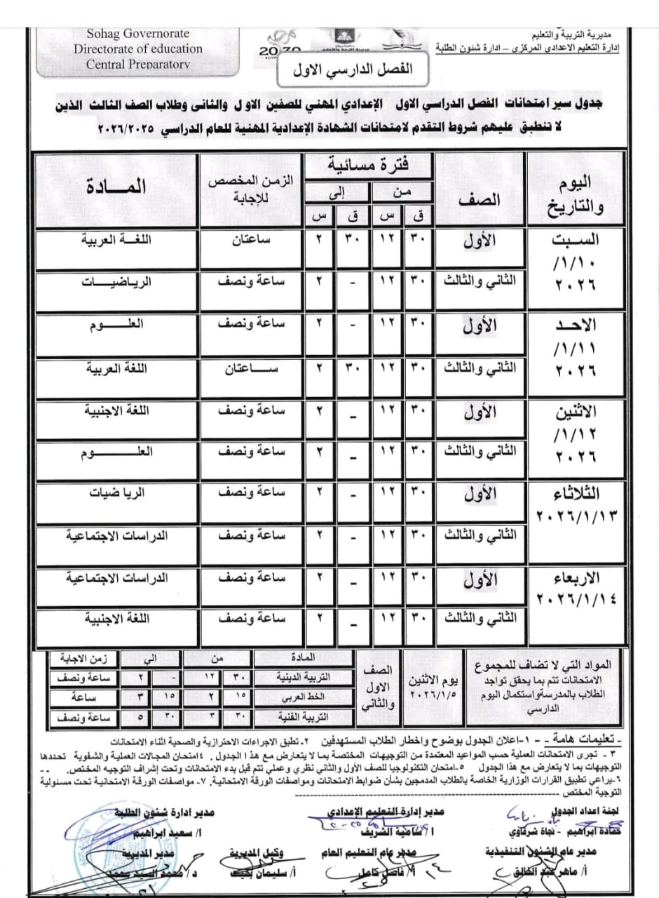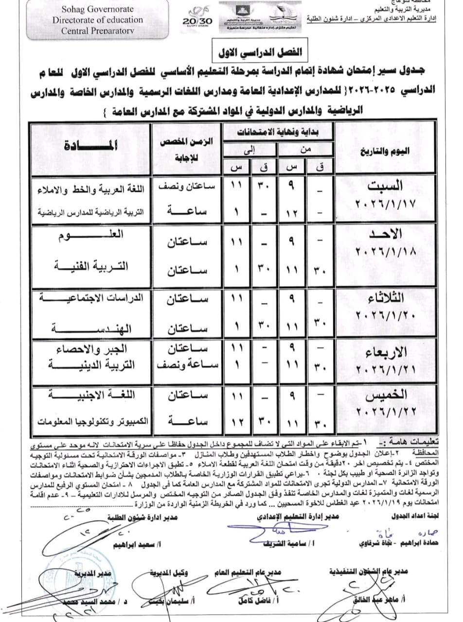 جداول امتحانات الفصل الدراسى الأول 2026 بسوهاج المرحلة الإعدادية