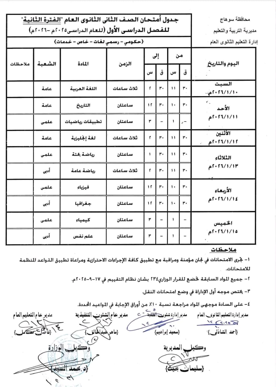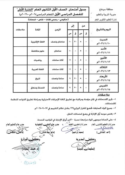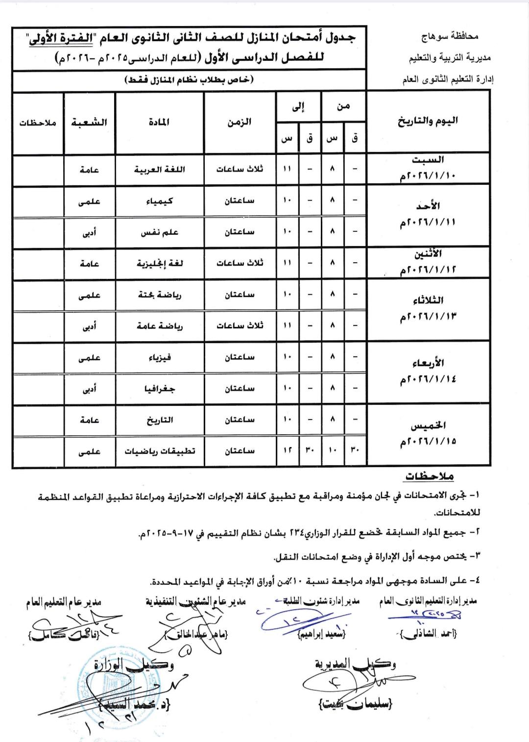 جداول امتحانات الفصل الدراسى الأول 2026 بسوهاج المرحلة الثانوية