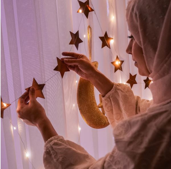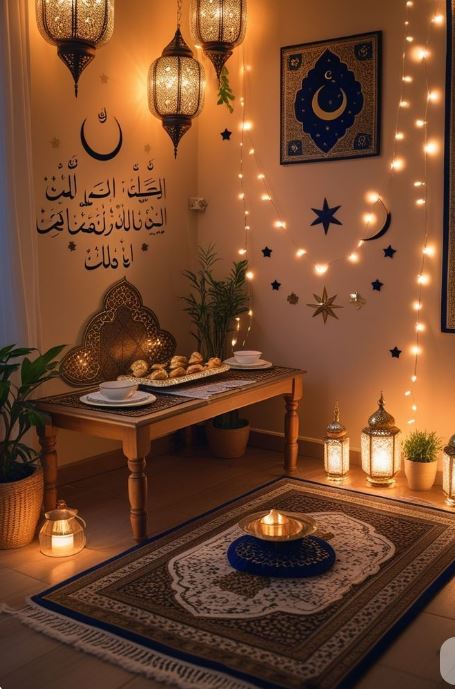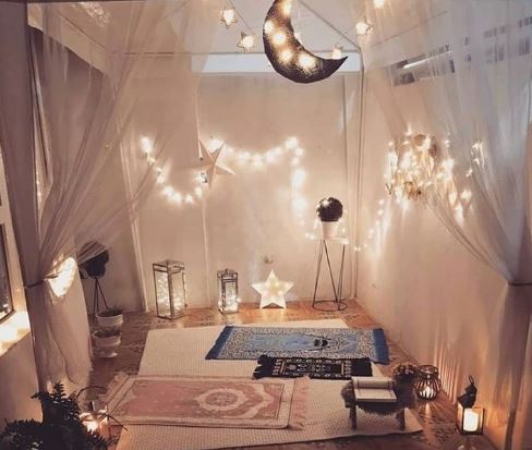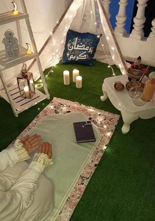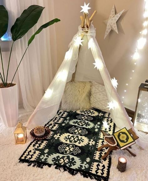 5- يمكنك تخصيص زاوية صغيرة داخل منزلك وافرشي سجادة صلاة جديدة تتناسب مع أجواء المكان، مع تزيين الحائط المقابل بمصابيح خافتة مستوحاة من شهر رمضان بأشكال النجوم والهلال أضيفي حامل مصحف خشبي أنيق بجانب السجادة لوضع المصحف بسهولة.