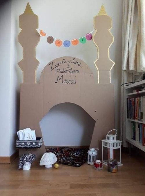 4- ضيفي بعض الإضاءات والمفارش الرمضانية على الكرتون، وتثبيتها عن طريق "السلوتيب" على الكرتون أو على الحائط.