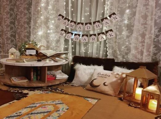 6-قومي بتوزيع بعض الوسائد المغطاة وأقمشة تحمل نقوشًا إسلامية أو رمضانية لتزيين الزاوية بشكل جميل ومريح. يمكنك أيضاً وضع فوانيس صغيرة مزينة، مع إضافة لمسة من الشموع المعطرة بروائح الورد أو المسك لتضفي أجواء دافئة ومميزة.