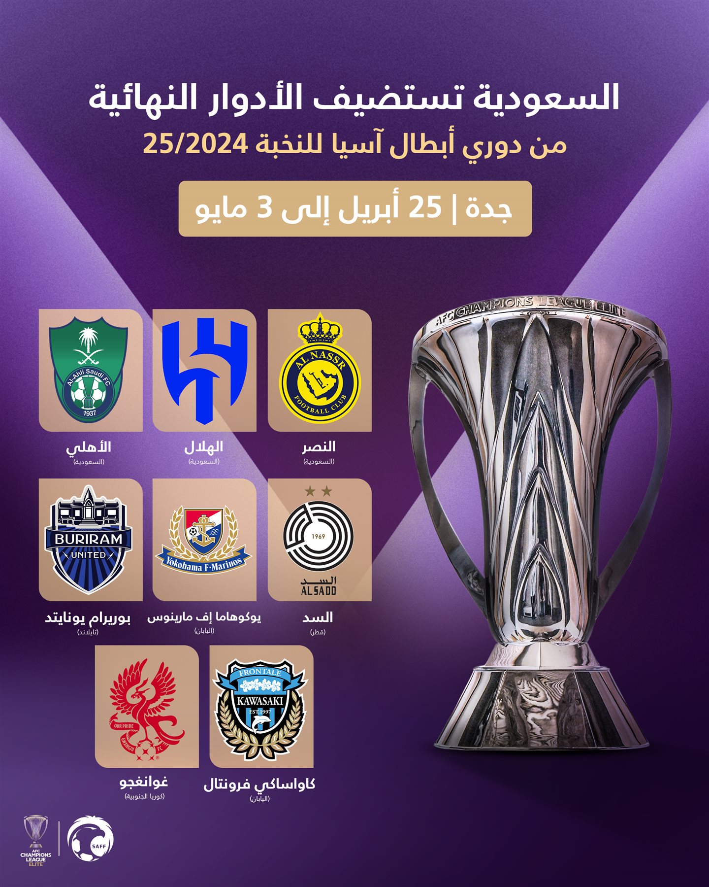 وستُقام البطولة في الفترة من 16 إلى 25 أبريل 2026، لتجمع أفضل الأندية الآسيوية في منافسة حاسمة ومثيرة.