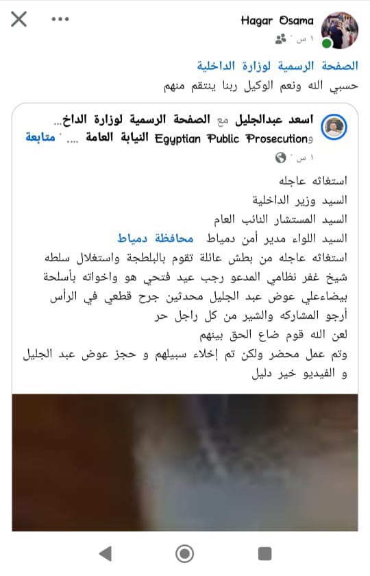 وتتضمن الاستغاثة كما تم نشرها على مواقع التواصل الاجتماعي التالي: استغاثه عاجله إلى السيد وزير الداخلية، والسيد المستشار النائب العام، والسيد اللواء مدير أمن دمياط محافظة دمياط، من بطش عائلة استغلت سلطة شيخ غفر نظامي المدعو رجب عيد فتحي هو واخواته بأسلحة بيضاء علي المدعو عوض عبد الجليل، محدثين إصابات بالرأس، وتم عمل محضر ولكن تم إخلاء سبيلهم وحجز عوض عبد الجليل المجني عليه، والفيديو خير دليل.
