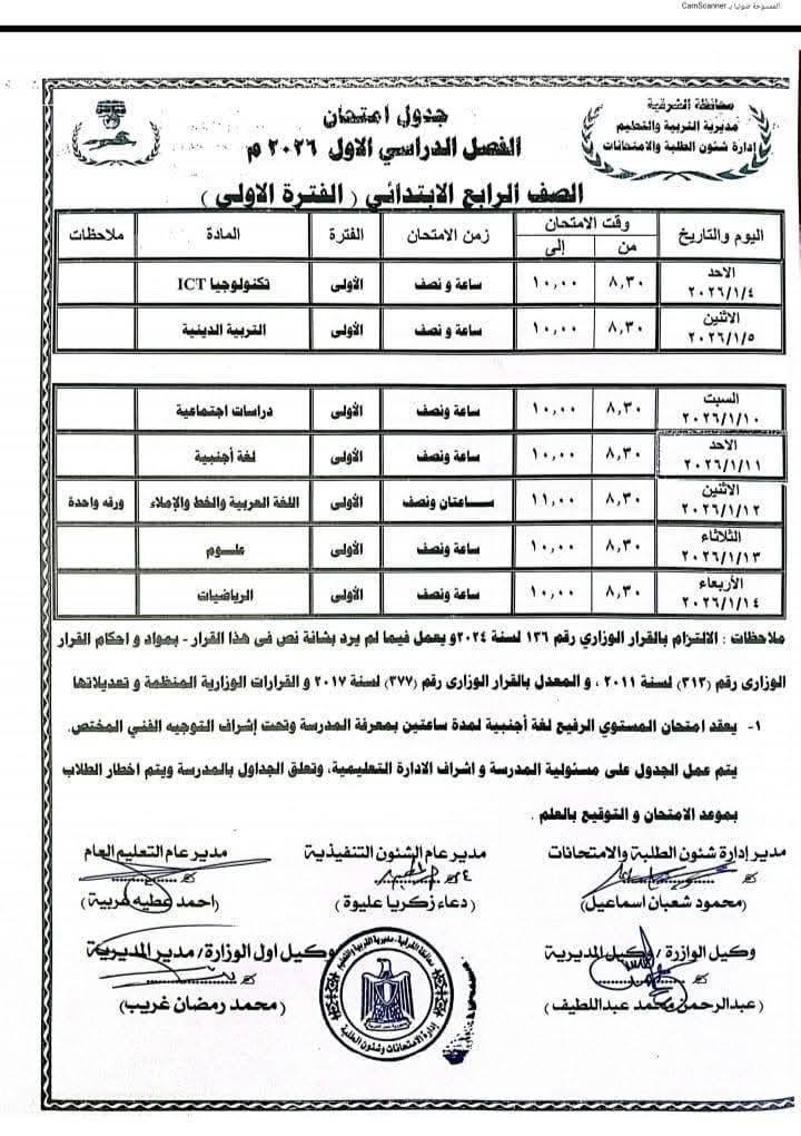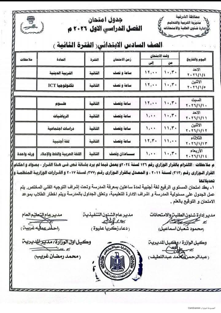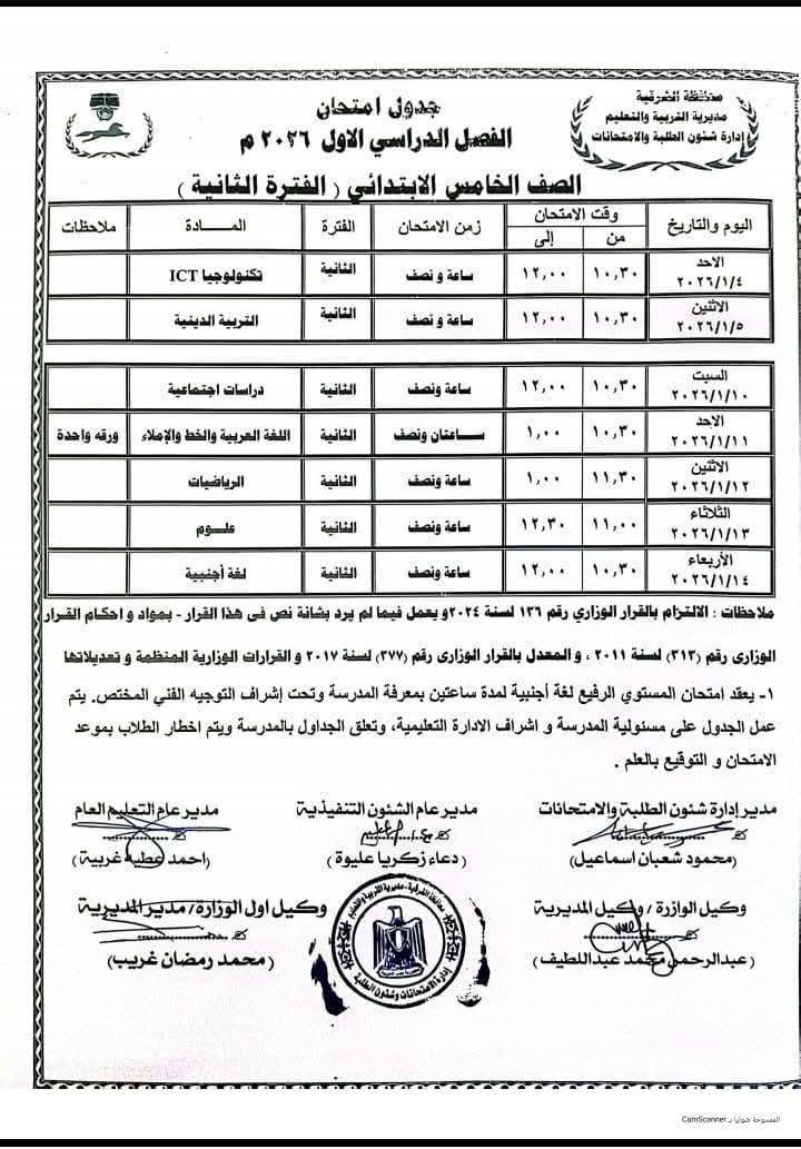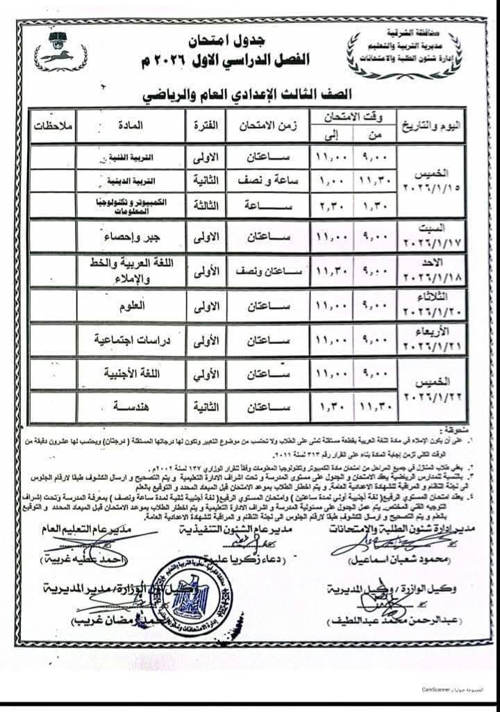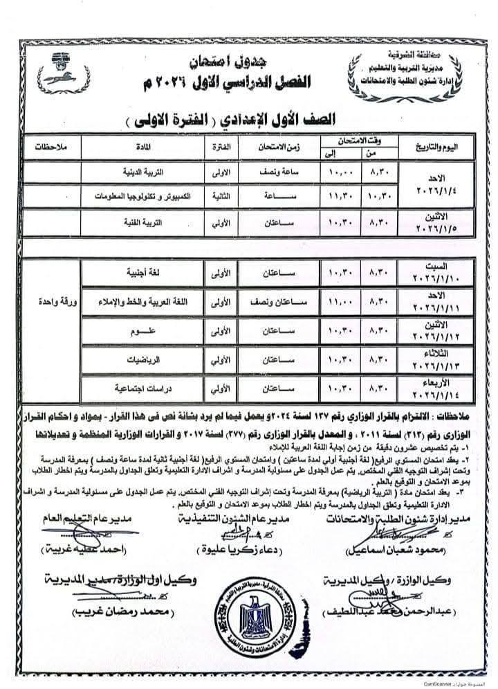 جدول امتحانات الشهادة الإعدادية 2026 الترم الأول محافظة الشرقية