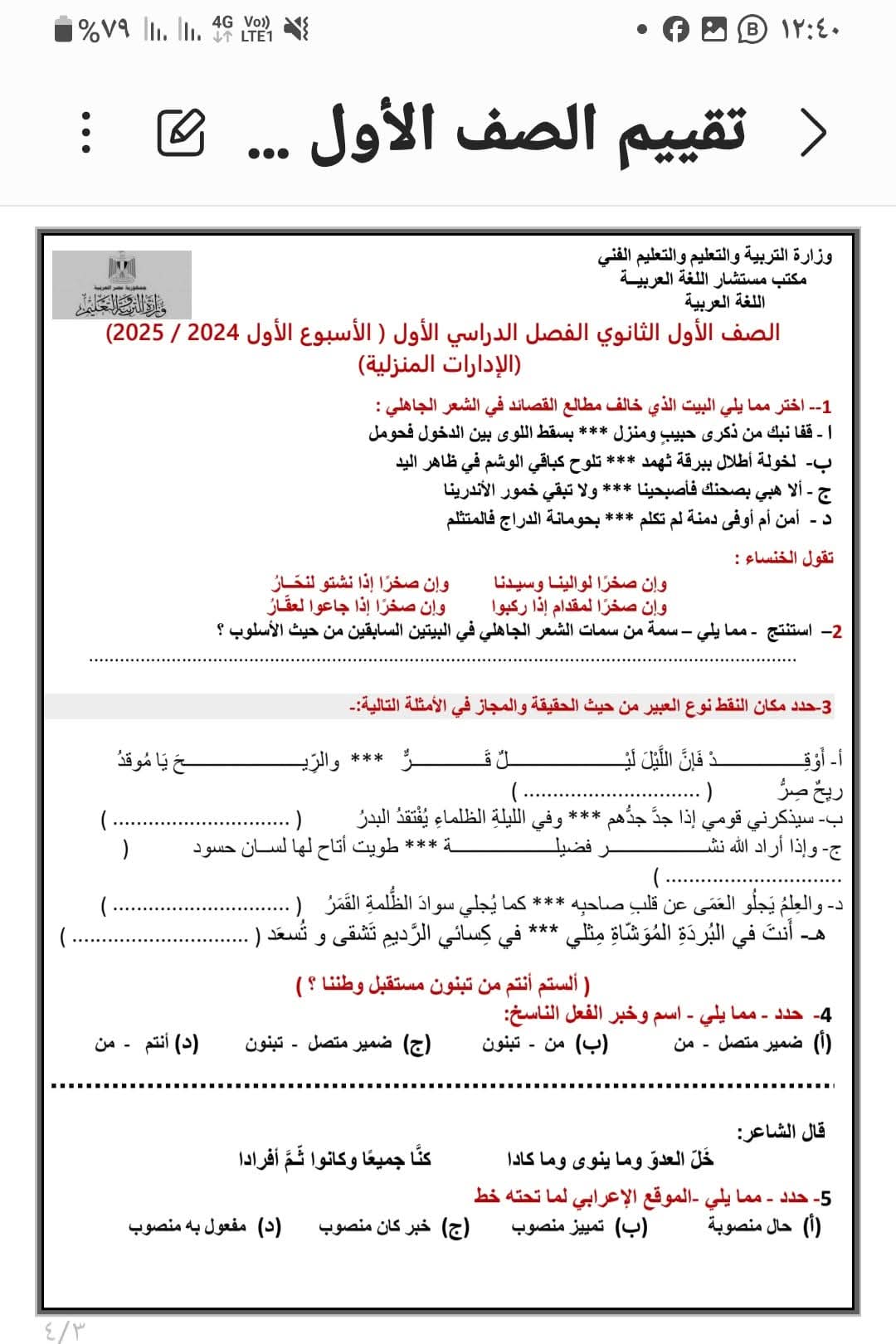 يحتوي حل التقييم الأسبوعي عربي أولى ثانوي الأسبوع الثاني عشر ترم أول 2026 على مجموعة من الأسئلة والإجابات، والتي منها الآتي:
