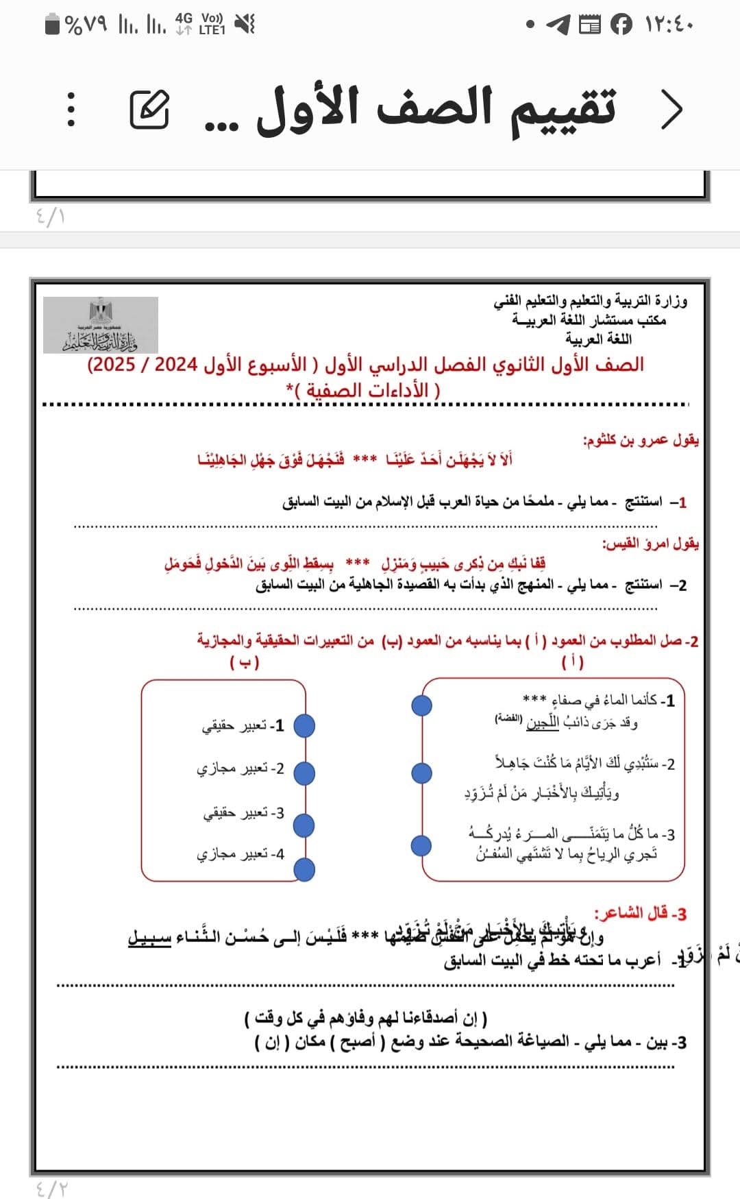 - حل الواجب المنزلي عربي أولى ثانوي الأسبوع الثاني عشر ترم أول 2026