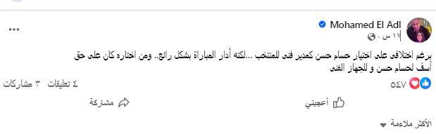 وكتب محمد العدل من خلال حسابه الرسمي "فيس بوك"" برغم اختلافى على اختيار حسام حسن كمدير فنى للمنتخب …لكنه أدار المباراة بشكل رائع.. ومن اختاره كان على حق ،آسف لحسام حسن و للجهاز الفنى".