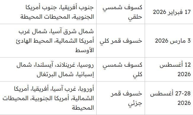 أما بالنسبة لخسوف القمر، فمن المقرر أن يحدث الأول في 3 مارس 2026، وسيكون خسوفًا كليًا يُمكن مشاهدته في آسيا وأستراليا وجزر المحيط الهادئ والأمريكتين بينما سيقع الخسوف الثاني يومي 27 و28 أغسطس 2026، وسيكون جزئيًا، حيث يمكن رؤيته في الأمريكتين وأوروبا وأفريقيا وغرب آسيا.