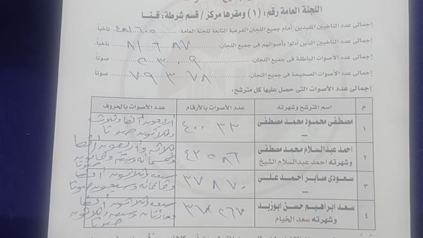 أعلنت اللجنة العامة للدائرة الأولي بقنا الحصر العددي لأعداد الناخبين الذين أدلوا بأصواتهم، وبلغ عدد المقيدين 481605 ناخبا، عدد من أدلوا بأصواتهم بلغ 81687 ناخبا، وعدد الأصوات الباطلة 2309 صوتا، وعدد الأصوات الصحيحة 79378 صوتا، وحصل المرشح مصطفى محمود 40033 صوتا، بينما حصل أحمد عبد السلام وشهرته احمد عبد السلام الشيخ 43586 صوتاً.