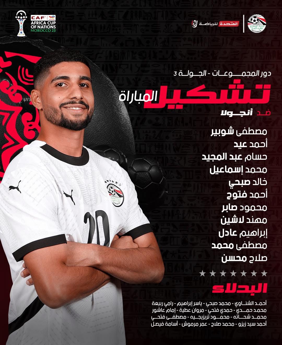 أعلن الجهاز الفني لمنتخب مصر الأول لكرة القدم، بقيادة حسام حسن، التشكيل الرسمي الذي يخوض به مواجهة أنجولا، في اللقاء المقرر إقامته على ملعب أدرار بمدينة أغادير المغربية، ضمن منافسات الجولة الأخيرة من دور المجموعات (المجموعة الثانية) ببطولة كأس الأمم الإفريقية 2025.