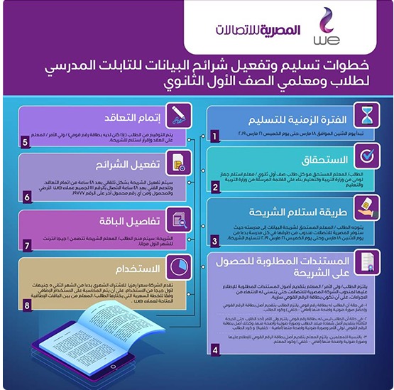 - -تفعيل الشريحة والتي يتم وضعها في التابلت ومن ثم الاتصال بخدمة عملاء we على الرقم 111 أو 19777 لمراجعة البيانات وتفعيل الشريحة.