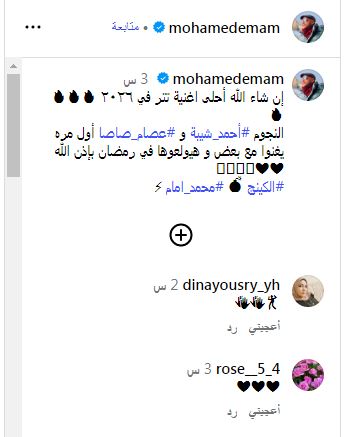 وكتب إمام " إن شاء الله احلى اغنية تتر في ٢٠٢٦ النجم أحمد شيبة و عصام صاصا أول مره يغنوا مع بعض و هيولعوها في رمضان بإذن الله ".