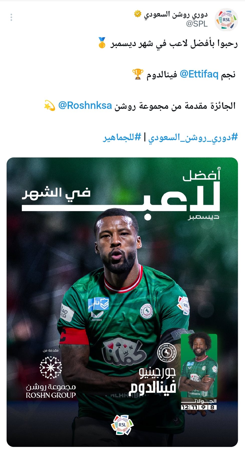 اختير نجم وسط نادي الاتفاق، الهولندي جورجينيو فينالدوم، كأفضل لاعب في الشهر، بعدما قدم أداءً استثنائياً خلال مباراتي فريقه في ديسمبر.