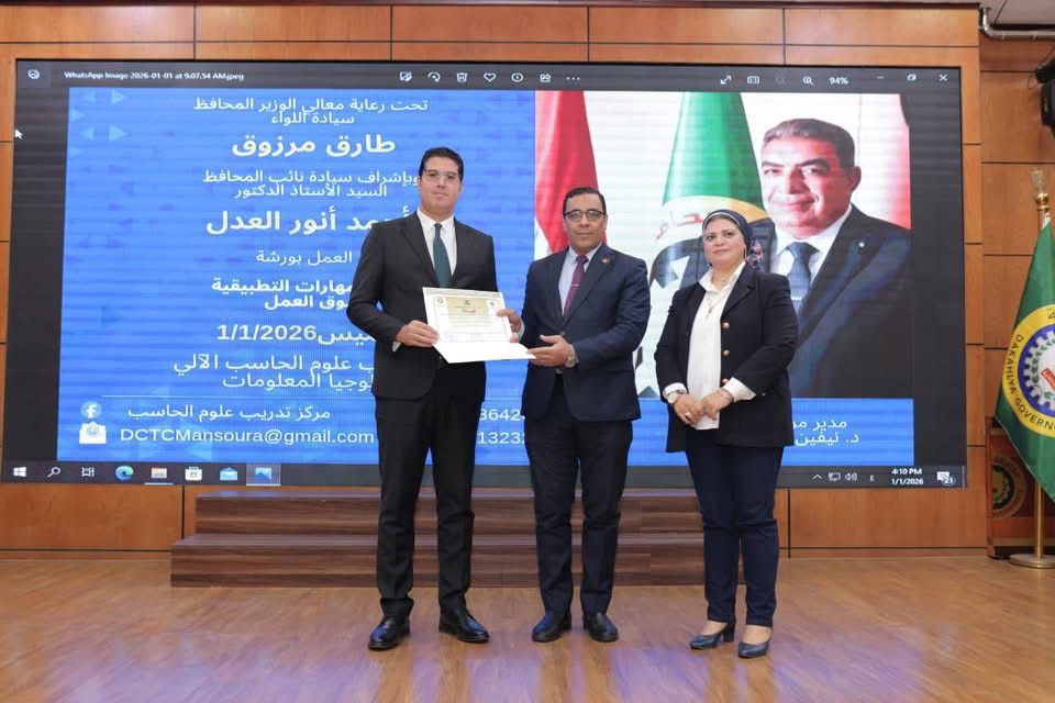 شهد الدكتور أحمد العدل، نائب محافظ الدقهلية، ختام فعاليات ورشة العمل التي نظمها مركز التدريب على الحاسب الآلي وتكنولوجيا المعلومات بالمحافظة، وسلم في ختامها شهادات الاجتياز للمتدربين الذين أكملوا البرنامج بنجاح، وذلك في إطار خطة المحافظة لتنمية المهارات الرقمية والمعرفية والإدارية لأبناء الدقهلية، تماشياً مع استراتيجية الدولة للتحول الرقمي وبناء الإنسان المصري.