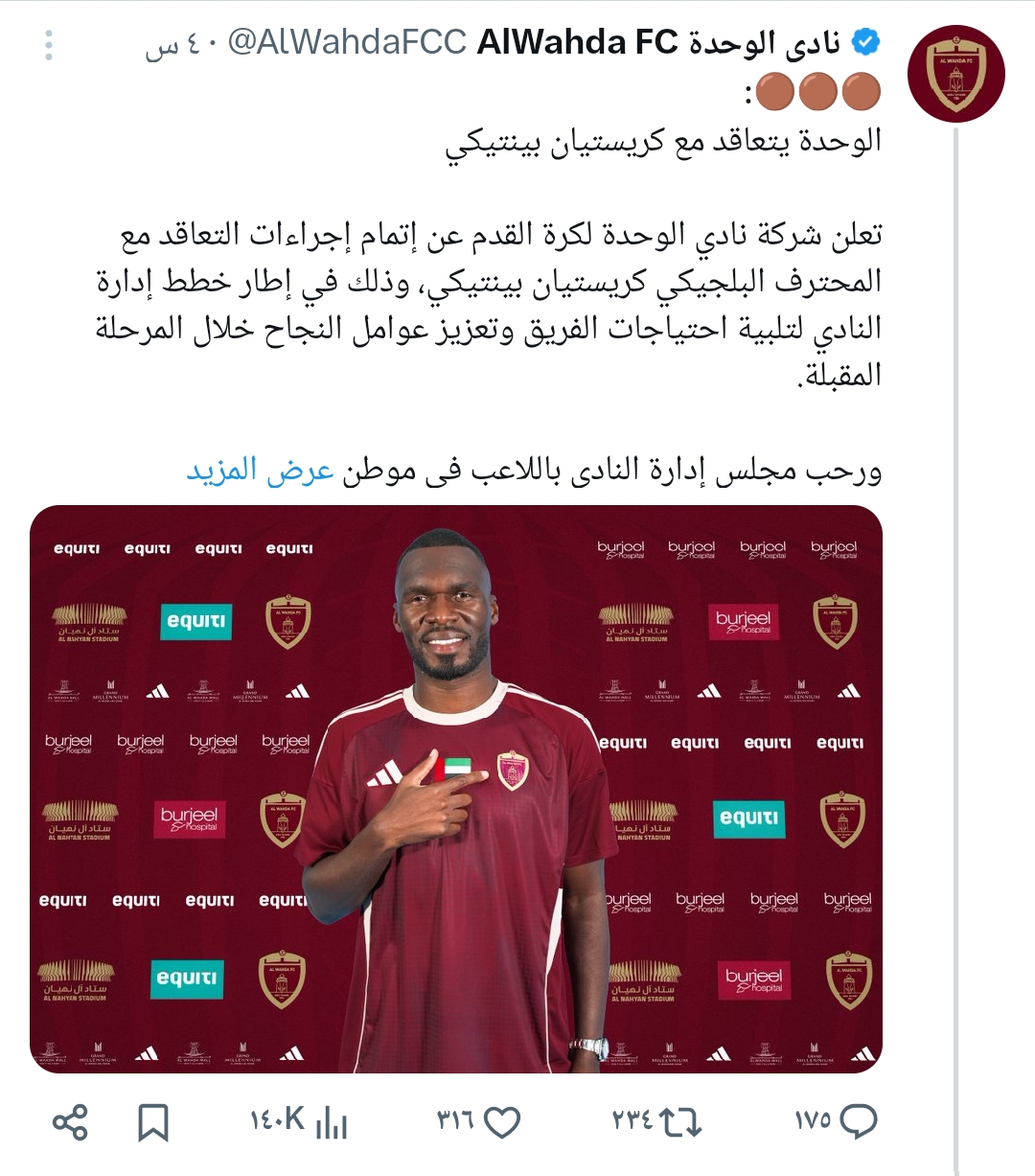 أعلن نادي الوحدة الإماراتي، اليوم الخميس، عن إتمام صفقة قوية بتعاقده مع المهاجم الدولي البلجيكي كريستيان بنتيكي، في صفقة انتقال حر.