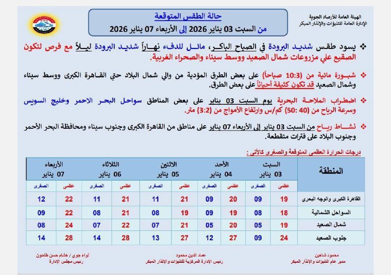 من أبرز ملامح حالة الطقس غدا السبت 3 يناير اضطراب الملاحة البحرية على بعض مناطق سواحل البحر الأحمر وخليج السويس ومن المتوقع أن تتراوح سرعة الرياح بين 40 و50 كم/س، مع ارتفاع الأمواج من 2 إلى 3 أمتار، ما يؤدي إلى صعوبة أعمال الصيد والملاحة البحرية، ويستوجب الالتزام بتعليمات الجهات المختصة حفاظاً على الأرواح والممتلكات.