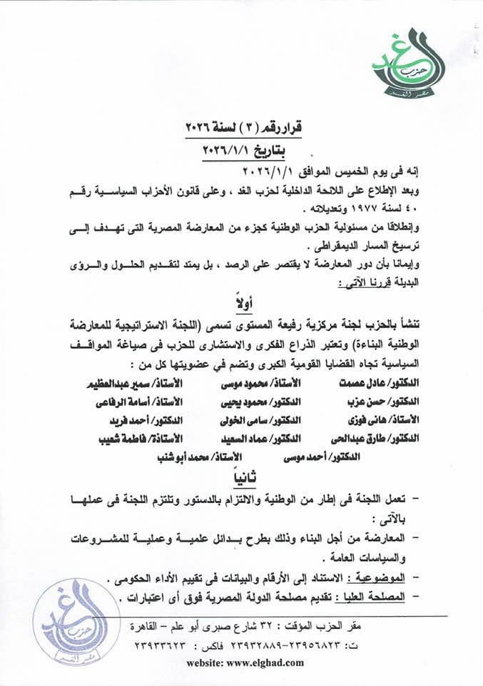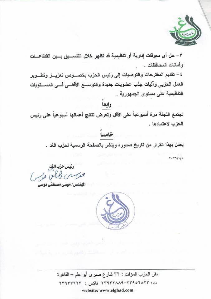 دشن المهندس موسى مصطفى موسى، رئيس حزب الغد، ملامح "ثورة تنظيمية" شاملة داخل أروقة الحزب مع مطلع العام الجديد، بإصداره حزمة قرارات أرقام 1، 2، 3 لسنة 2026) تهدف إلى إعادة هيكلة الأداء السياسي وتفعيل التواصل بين القيادة المركزية والمجالس النيابية والقواعد الشعبية.