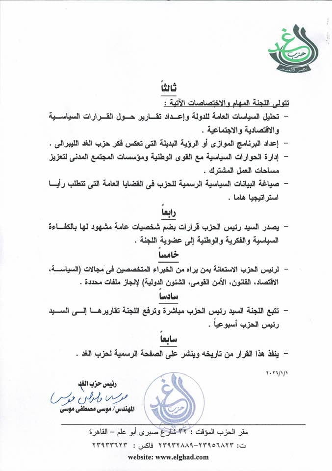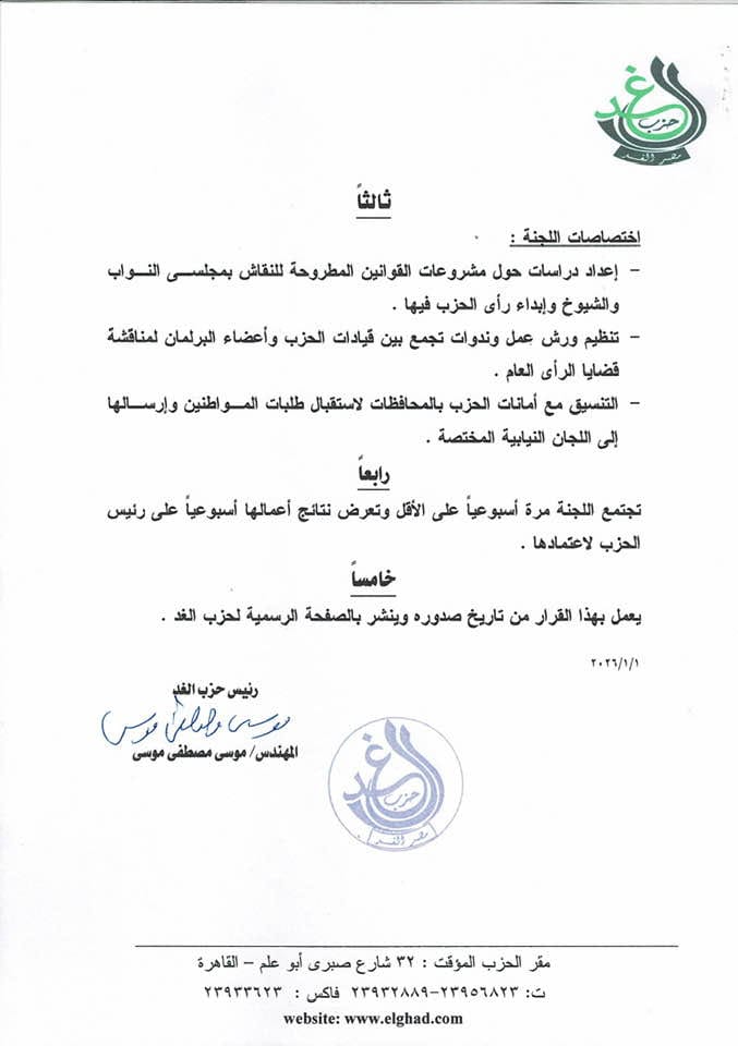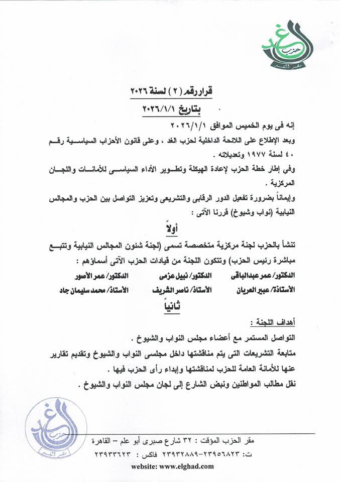 استهدف القرار رقم (2) تفعيل الدور التشريعي للحزب عبر لجنة متخصصة لمتابعة أداء نواب الغد بمجلسي النواب والشيوخ، وتضم الأعضاء: د. عمر عبد الباقي، د. نبيل عزمي، د. عمر الأصور، عبير العريان، ناصر الشريف، ومحمد سليمان جاد.