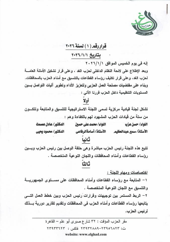 وأكدت القرارات على أن تعمل هذه اللجان تحت الإشراف المباشر لرئيس الحزب، مع الالتزام بعقد اجتماعات أسبوعية بحد أدنى، ورفع تقارير دورية بنتائج أعمالها.