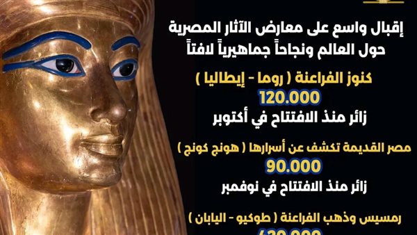 ووفقًا للإحصاءات الرسمية، استقطب معرض «كنوز الفراعنة» في روما نحو 120 ألف زائر منذ افتتاحه في أكتوبر الماضي، بينما شهد معرض «مصر القديمة تكشف عن أسرارها: كنوز من المتاحف المصرية» في هونج كونج زيارة نحو 90 ألف شخص منذ افتتاحه في نوفمبر الماضي. كما يواصل معرض «رمسيس وذهب الفراعنة» نجاحه في طوكيو، حيث استقطب حتى الآن نحو 420 ألف زائر منذ افتتاحه في مارس الماضي.