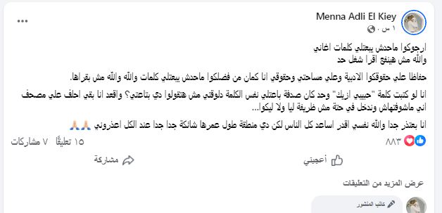 وقالت منة في منشورها من خلال حسابها الرسمي "فيس بوك"ارجوكم محدش يبعتلي كلمات اغاني والله مش هينفع اقرأ شغل حد حفاظا على حقوقكوا الادبية وعلي مساحتي وحقوقي انا كمان من فضلكوا ماحدش يبعتلي كلمات والله والله مش بقراها.
