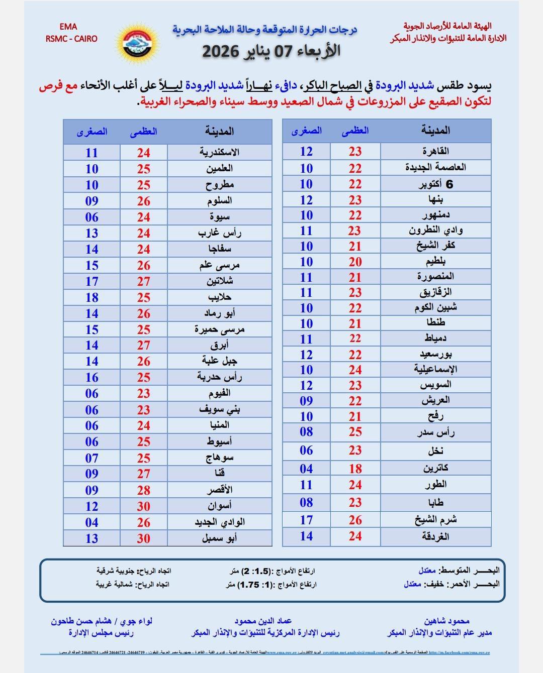 كشفت الهيئة العامة للأرصاد الجوية، عن حالة الطقس ودرجات الحرارة المتوقعة التى يشهدها اليوم الأربعاء 7 يناير 2026، على كافة أنحاء المحافظات والمدن المصرية.