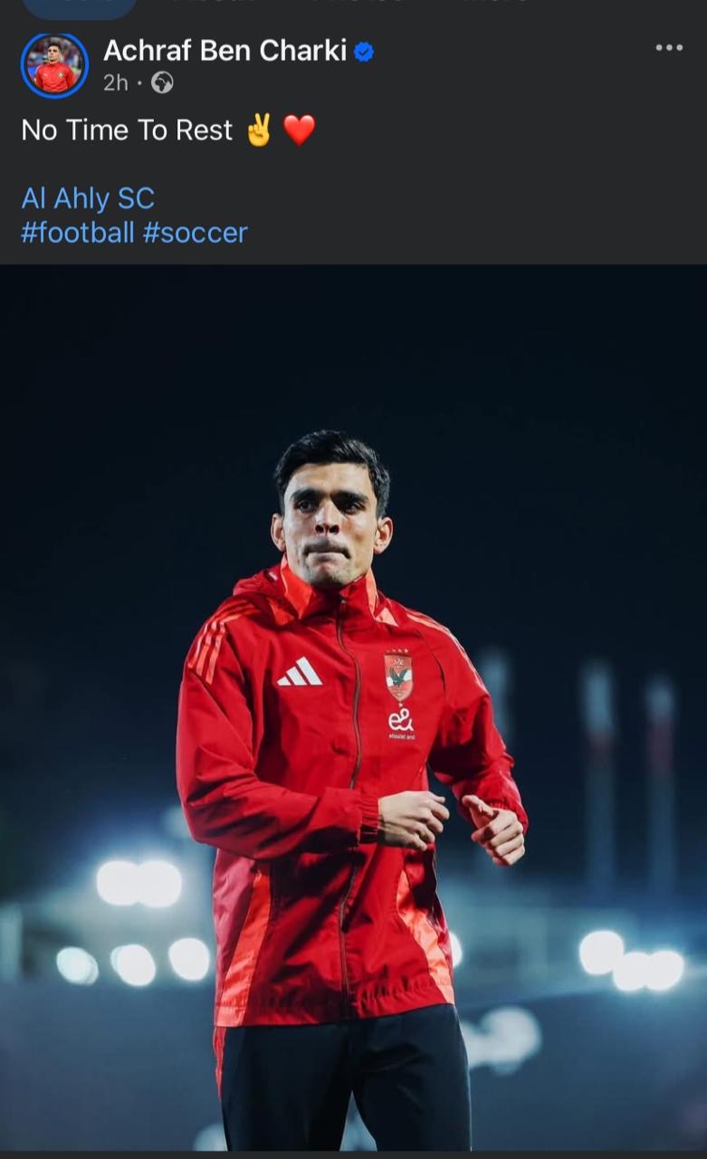 نشر أشرف بن شرقي، لاعب الفريق الأول لكرة القدم بالنادي الأهلي، أول تعليق له بعد اقترابه من العودة للمشاركة مع الفريق، عقب تعافيه من الإصابة التي أبعدته عن الملاعب خلال الفترة الماضية.