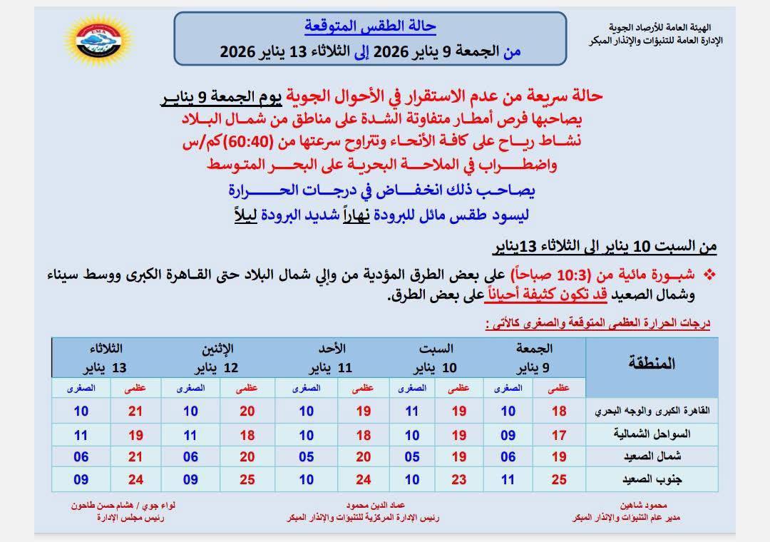 ويستعرض موقع مصر تايمز في هذا التقرير أهم تفاصيل حالة الطقس من الجمعة 9 يناير وحتى الثلاثاء 13 يناير 2026، اعتمادًا على البيانات المعلنة من إدارة التنبؤات والإنذار المبكر.