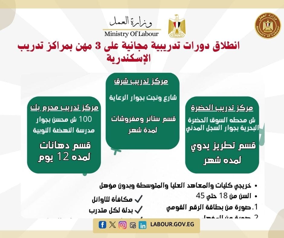 8. انطلاق دورات تدريبية مجانية على 3 مهن بمراكز تدريب الإسكندرية