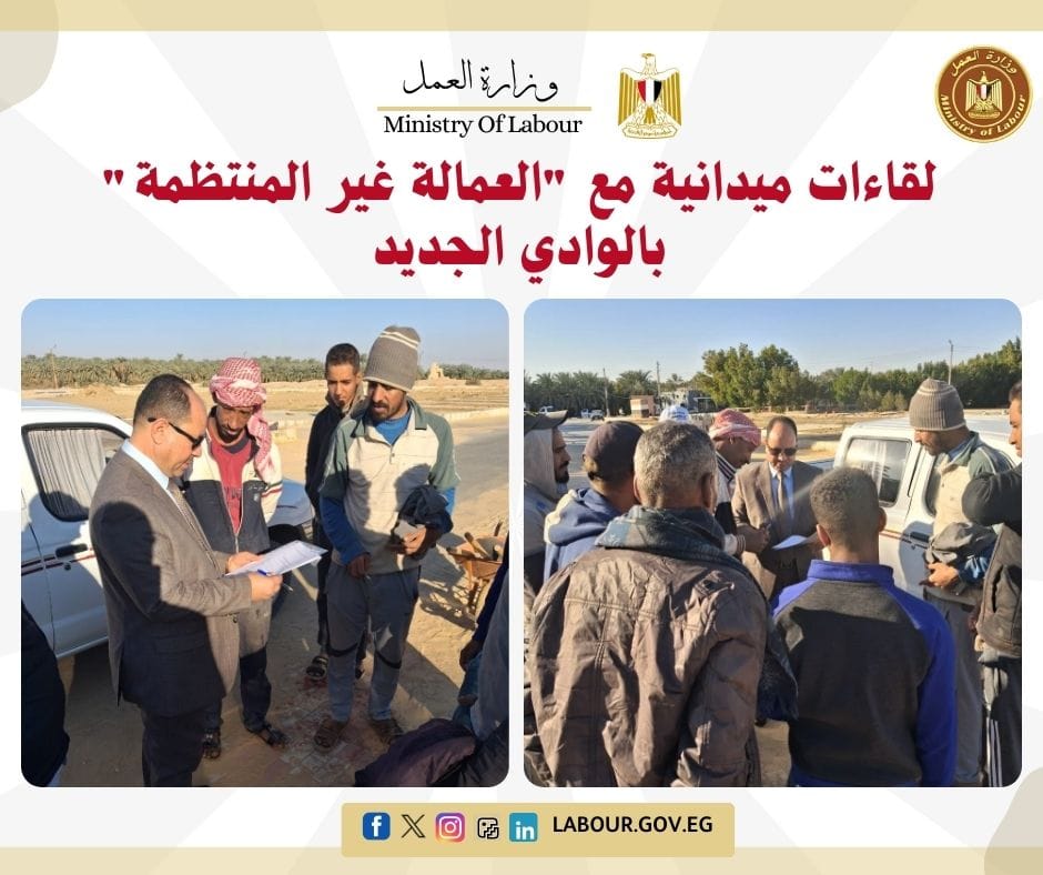 عقد أسامة إبراهيم، مدير مديرية العمل بالوادي الجديد، سلسلة لقاءات مباشرة مع مجموعات من العمالة غير المنتظمة في مواقع عملهم. استهدفت اللقاءات الاستماع إلى مطالبهم وبحث سبل تعزيز حمايتهم ورعايتهم اجتماعياً وصحياً، تنفيذاً لرسالة الوزارة في صون حقوق كافة فئات القوى العاملة.