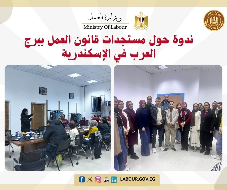 نظمت مديرية العمل بالإسكندرية ندوة توعوية بمصنع "جاليك" للملابس ببرج العرب، بحضور عبد الونيس عبد الله وكيل المديرية. تناولت الندوة مستجدات قانون العمل فيما يخص ضوابط التعاقد، ساعات العمل، وفض المنازعات، لتعزيز الوعي القانوني وضمان استقرار العلاقة بين العمال وإدارة المنشأة.