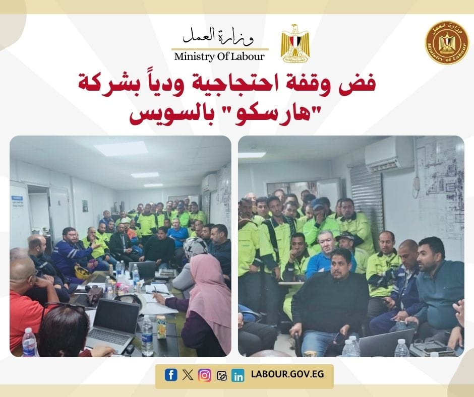 نجحت مديرية العمل بالسويس في فض وقفة احتجاجية لـ 45 عاملاً بشركة "هارسكو ميتال" من خلال التفاوض الودي. وانتقلت لمياء محمود مدير المديرية لمقر الشركة لحل النزاع وضمان حصول العمال على حقوقهم القانونية، مما أدى لانتظام العمل بكامل طاقته والحفاظ على استقرار المنشأة.
