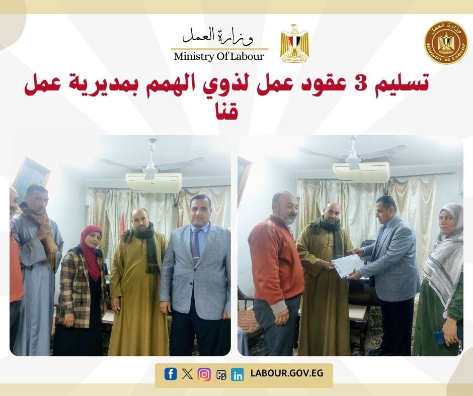 سلم أحمد محمد معوض، مدير مديرية العمل بقنا، 3 عقود عمل جديدة لشباب من ذوي الهمم للعمل بشركات القطاع الخاص بمركز قفط ونقادة. وأكد المدير أن هذه الخطوة تأتي تنفيذاً لتوجيهات القيادة السياسية بدمج ذوي القدرات الخاصة في سوق العمل وتوفير حياة كريمة لهم.