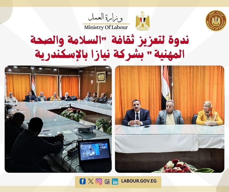 نظمت مديرية العمل بالإسكندرية ندوة توعوية بشركة "نيازا" للأجهزة الكهربائية، تحت رعاية الأستاذ عبد الونيس عبد الله وكيل مديرية العمل. تناولت الندوة، التي شهدت حضور 40 عاملاً، سبل الوقاية من المخاطر الهندسية ومخاطر بيئة العمل، وذلك ضمن سلسلة ندوات "سلامتك تهمنا" التي تهدف إلى حماية الأفراد والمنشآت وتوفير مناخ عمل آمن ومستقر تنفيذاً لتوجيهات وزير العمل محمد جبران .