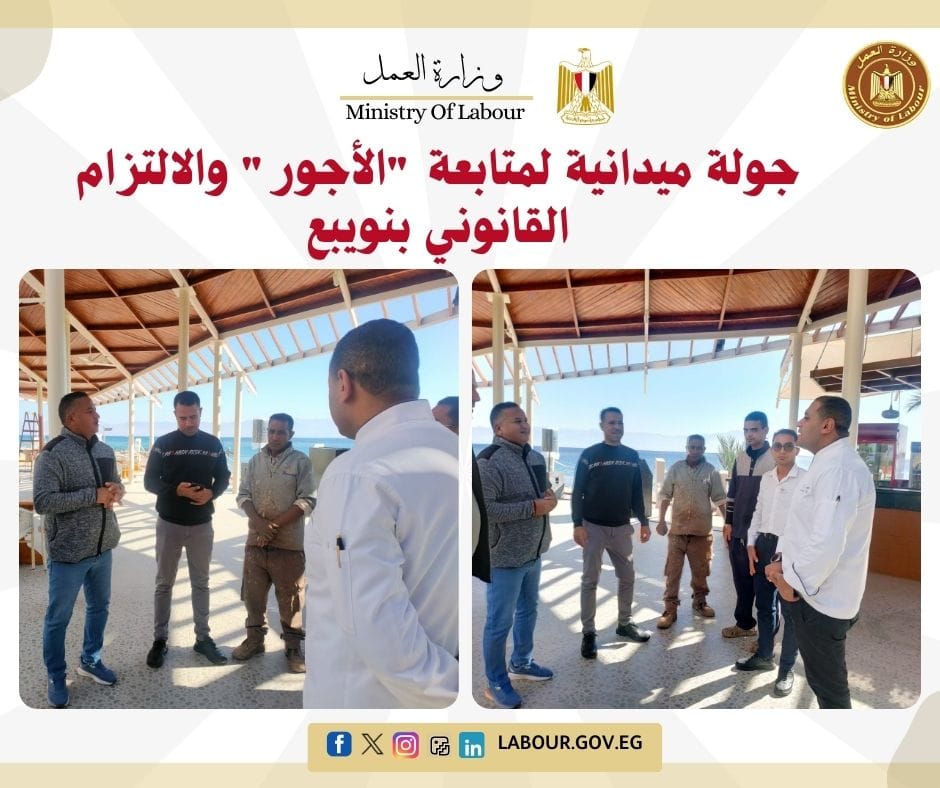 نفذ مكتب عمل نويبع بجنوب سيناء جولة تفتيشية بفندق "ستراند طابا"، لمتابعة الالتزام بالحد الأدنى للأجور وأحكام قانون العمل الجديد رقم 14 لسنة 2025. استهدفت الجولة ضمان حقوق العاملين وتعزيز الرقابة الميدانية لتحقيق التوازن بين طرفي العملية الإنتاجية في القطاع السياحي.