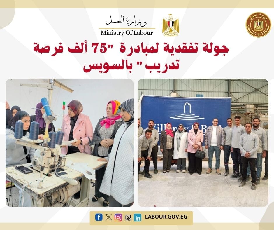 قادت لمياء محمود، مدير مديرية العمل بالسويس، جولة لمتابعة تدريب 100 شاب وفتاة داخل شركات (بلازا للملابس، وفي أند بي للأدوات الصحية، وكادي للمنسوجات). تهدف المبادرة إلى تأهيل المتدربين داخل صالات الإنتاج مع الاتفاق على تعيين المتميزين منهم فور انتهاء فترة التدريب.