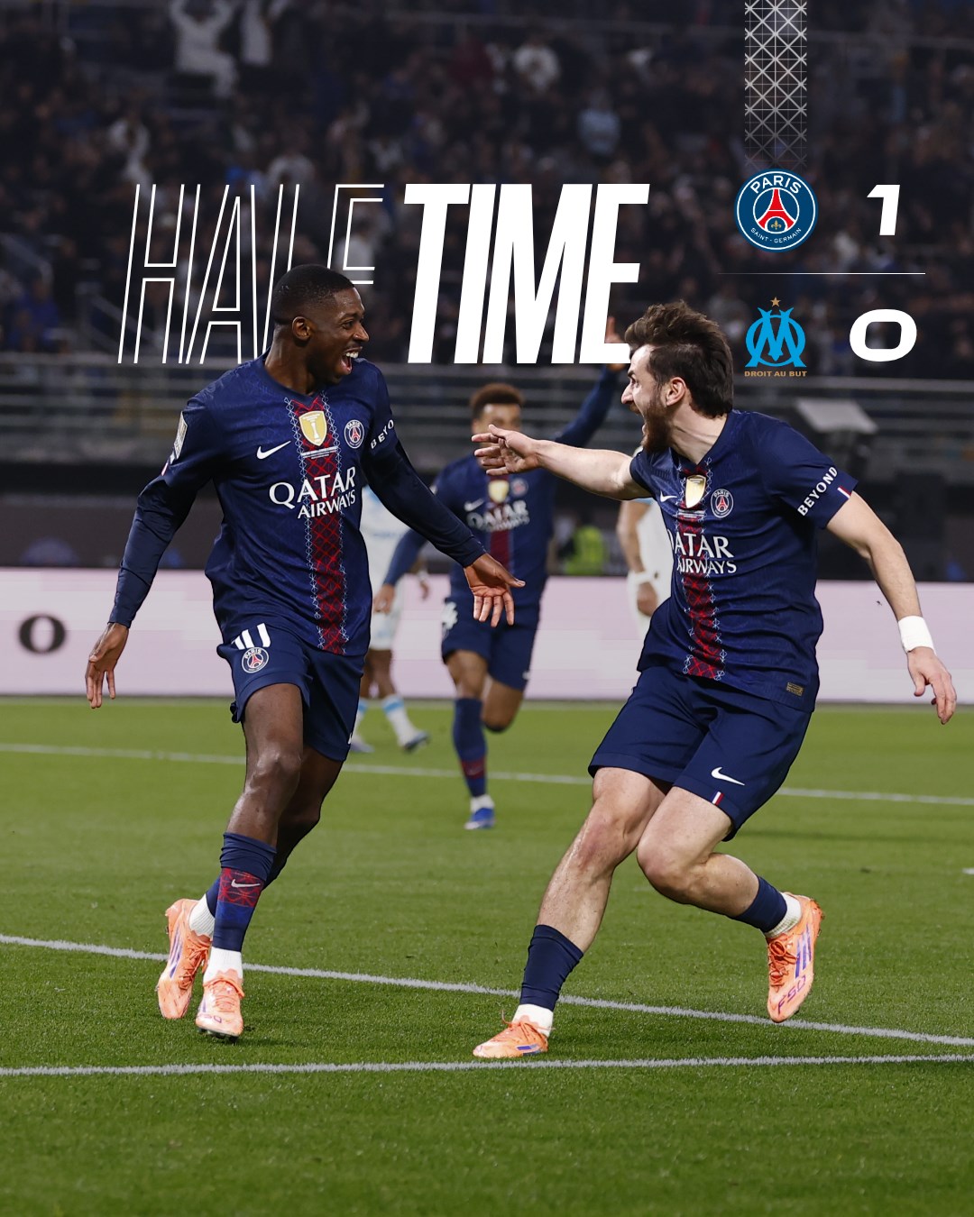 فرض باريس سان جيرمان سيطرة شبه كاملة على مجريات الشوط الأول من مباراته أمام غريمه التقليدي أولمبيك مارسيليا، المقامة على "استاد جابر الأحمد الدولي" في الكويت، ضمن نهائي كأس السوبر الفرنسي، وأنهى الشوط متقدماً بهدف دون رد.