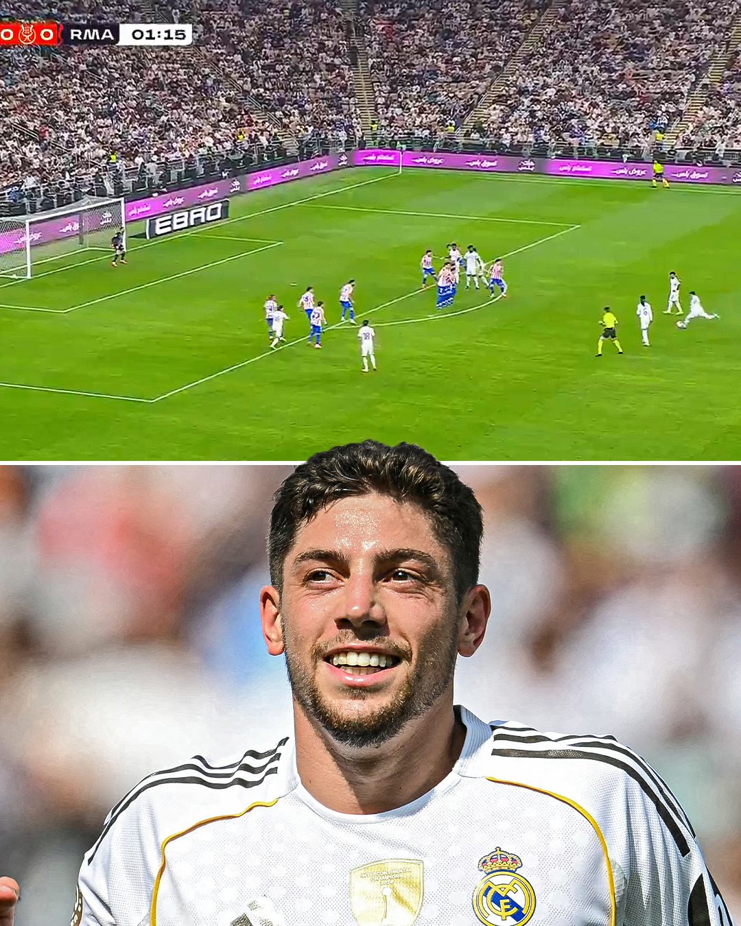 الدقيقة 3 - هدف فالفيردي: انبرى فيديريكو فالفيردي لتنفيذ ركلة حرة مباشرة من موقع خطير، وأطلق تسديدة صاروخية مقوسة بقدمه اليمنى، سكنت شباك الحارس يان أوبلاك مباشرة، معلنة عن هدف تقني بارع منح الفريق الملكي تقدماً مبكراً وثقة كبيرة.