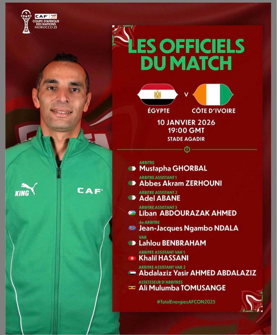 وأسند الكاف قيادة المباراة للحكم الجزائري مصطفى غربال، ويعاونه زميلاه عباس زرهوني وعادل أباني، فيما يتولى عبد الرازق أحمد من جيبوتي مهمة المساعد الثالث، على أن يكون الكونغولي جون جاك ندالا حكماً رابعاً.