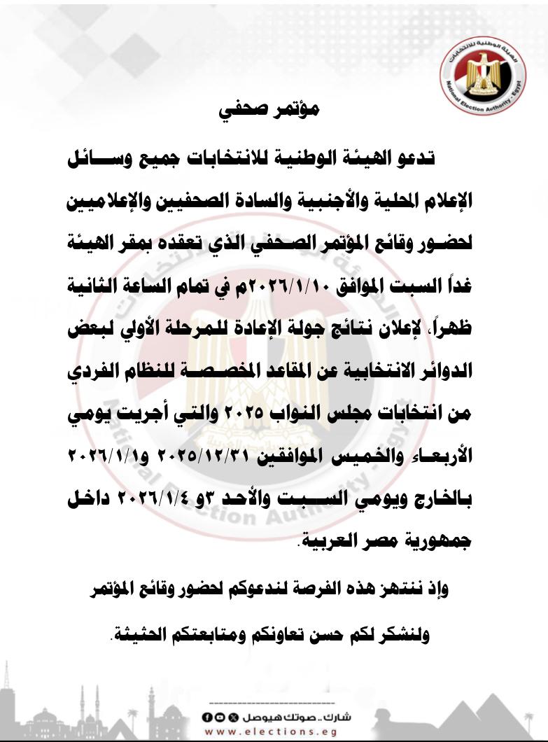 أعلنت الهيئة الوطنية للانتخابات عن عقد مؤتمر صحفي غدًا السبت، الموافق 10 يناير 2026، في تمام الساعة الثانية ظهرًا بمقرها، لحضور جميع وسائل الإعلام المحلية والأجنبية والصحفيين والإعلاميين.