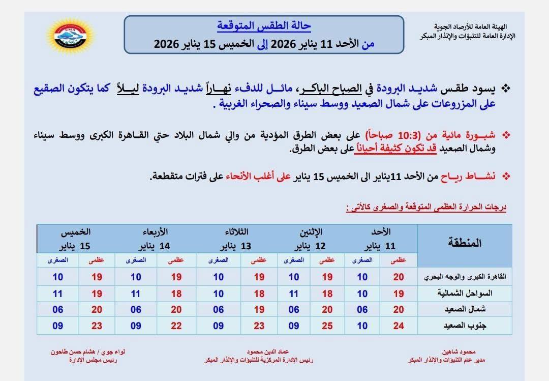 حالة الطقس غدًا الأحد 11 يناير2026.. في ظل التغيّرات الجوية المتسارعة التي تشهدها مصر خلال شهر يناير، أعلنت الهيئة العامة للأرصاد الجوية تفاصيل حالة الطقس المتوقعة بداية من غدٍ الأحد 11 يناير 2026 وحتى الخميس 15 يناير، حيث تسود أجواء شديدة البرودة في ساعات الصباح الباكر والليل، مع نشاط للرياح وتكوّن الصقيع على عدد من المناطق الزراعية.