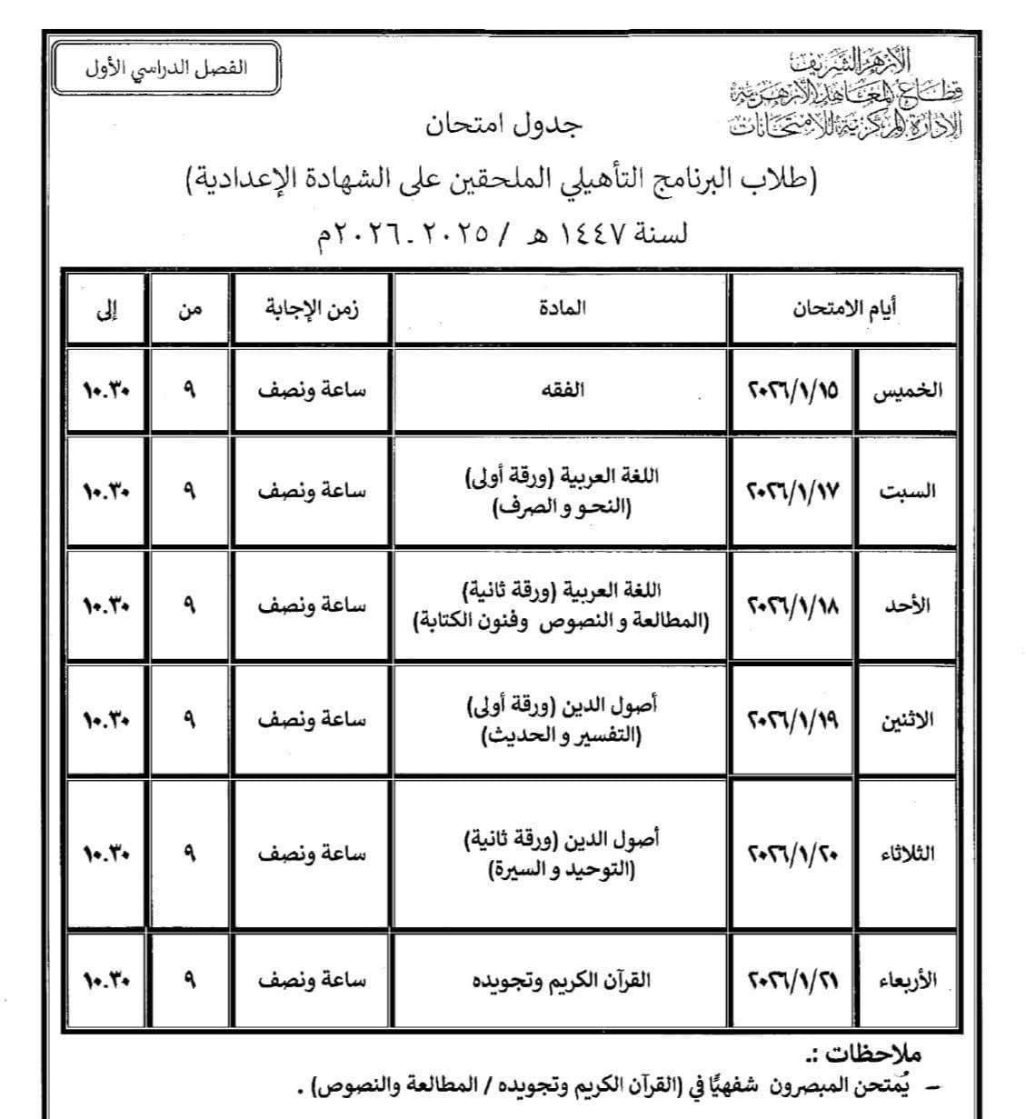 حيث تقرر بدء الامتحانات لطلاب الصف السادس الابتدائي، وطلاب الشهادة الإعدادية، إلى جانب طلاب البرنامج التأهيلي الملحقين بالشهادة الإعدادية، اعتبارًا من يوم الخميس الموافق 15 يناير 2026، وذلك وفق الجداول الرسمية المعتمدة من قطاع المعاهد الأزهرية.