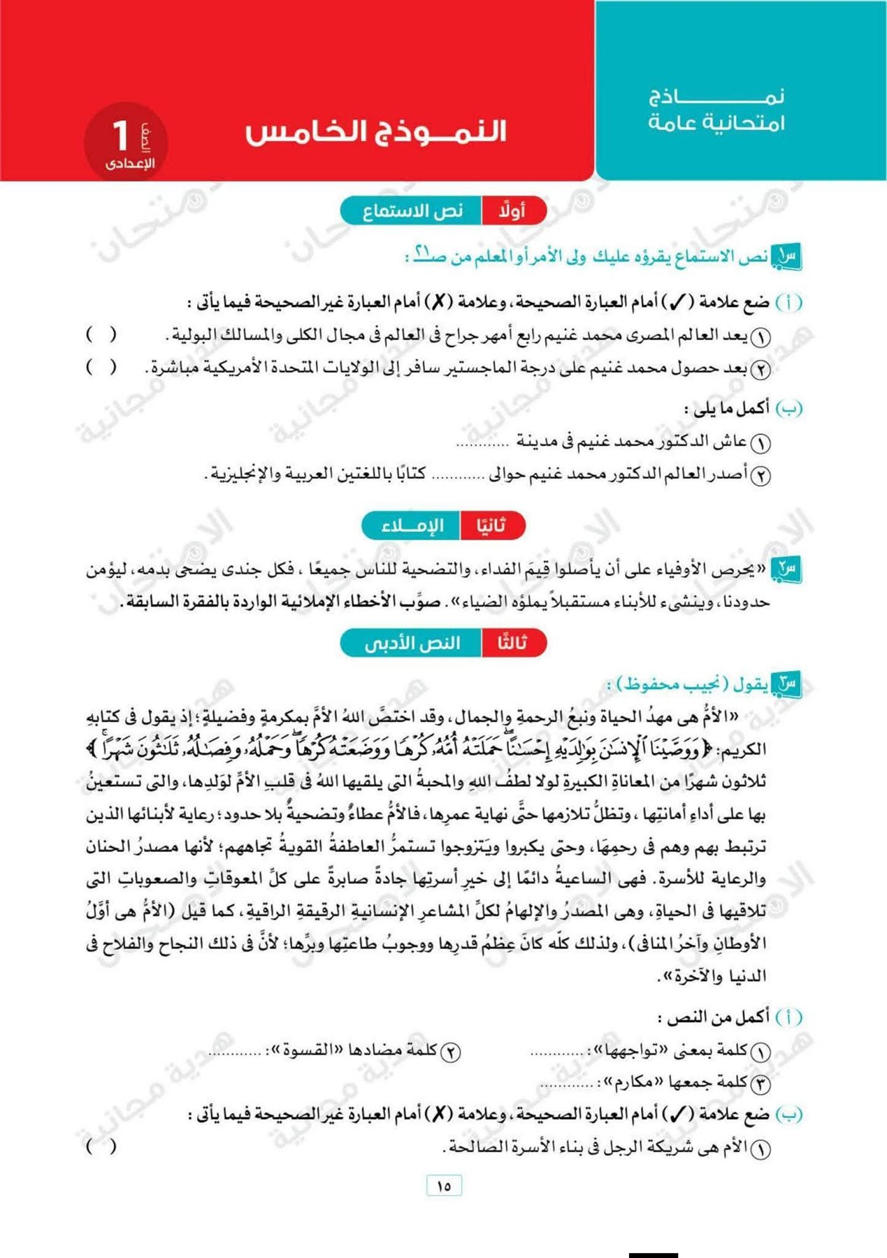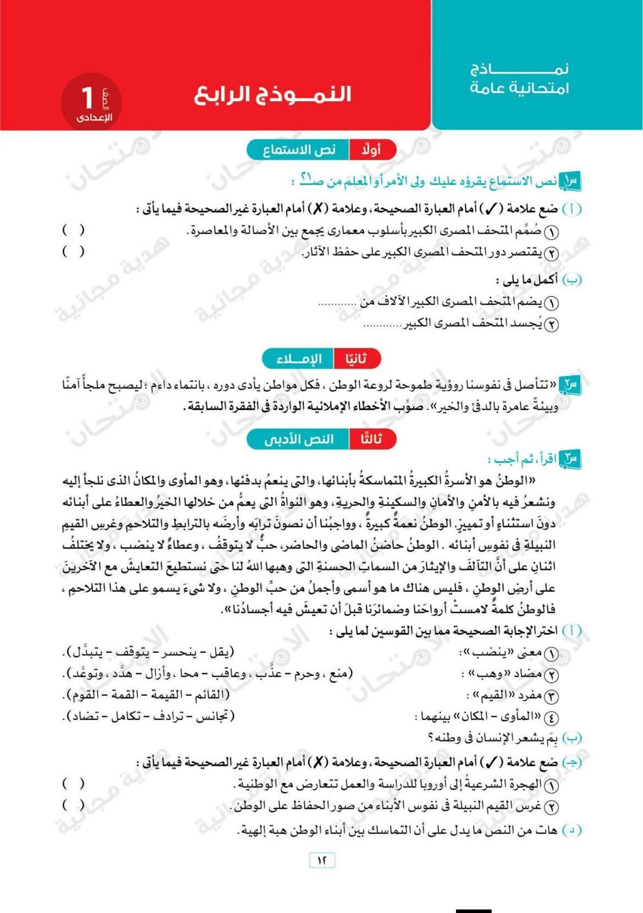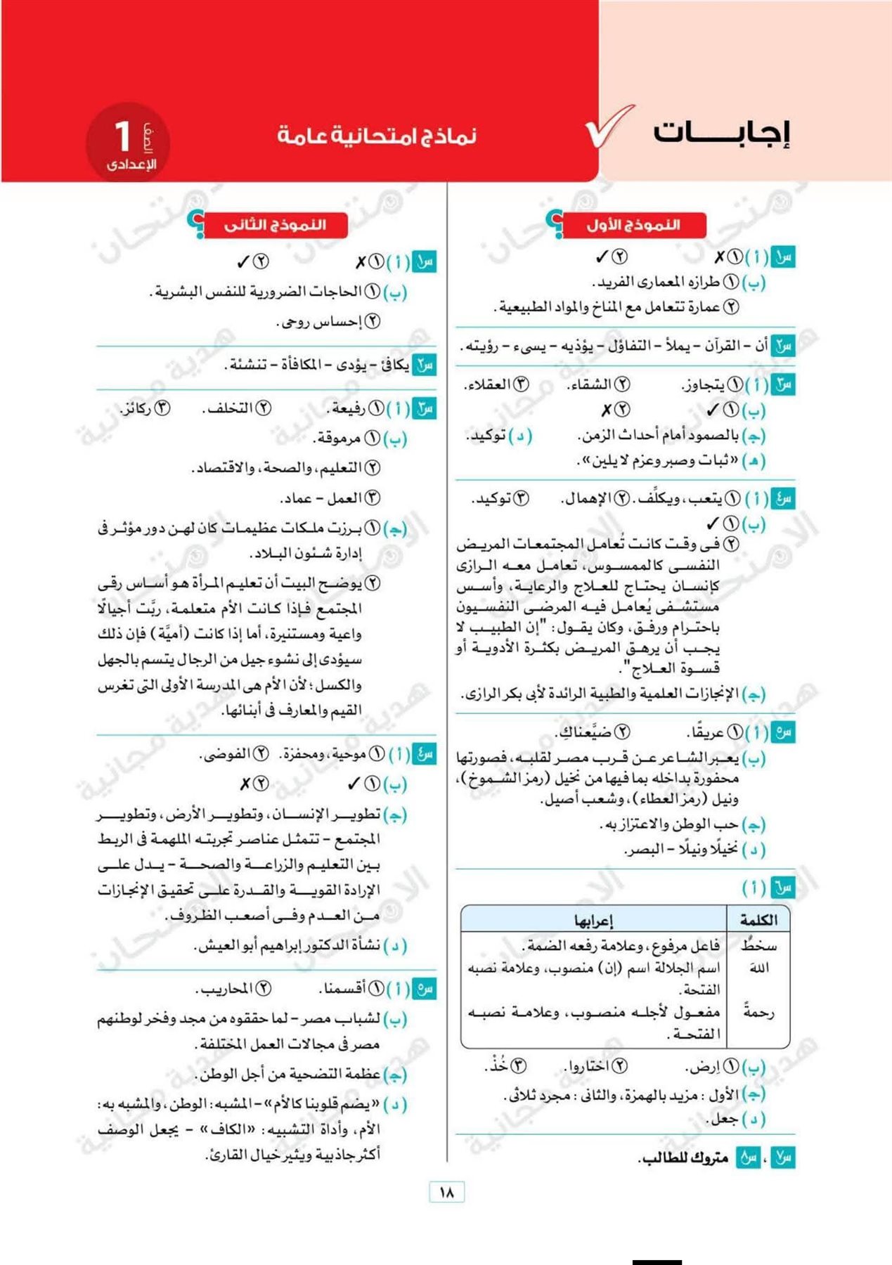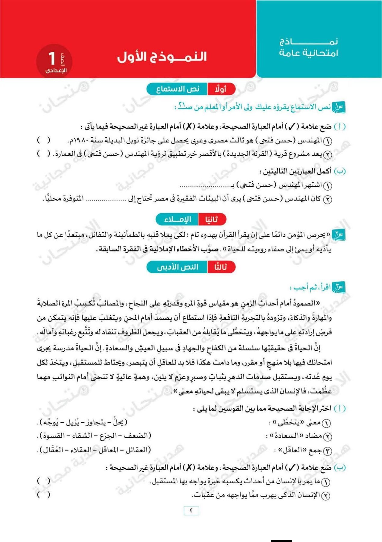 - نماذج امتحانات عربي الصف الأول الإعدادي محلولة