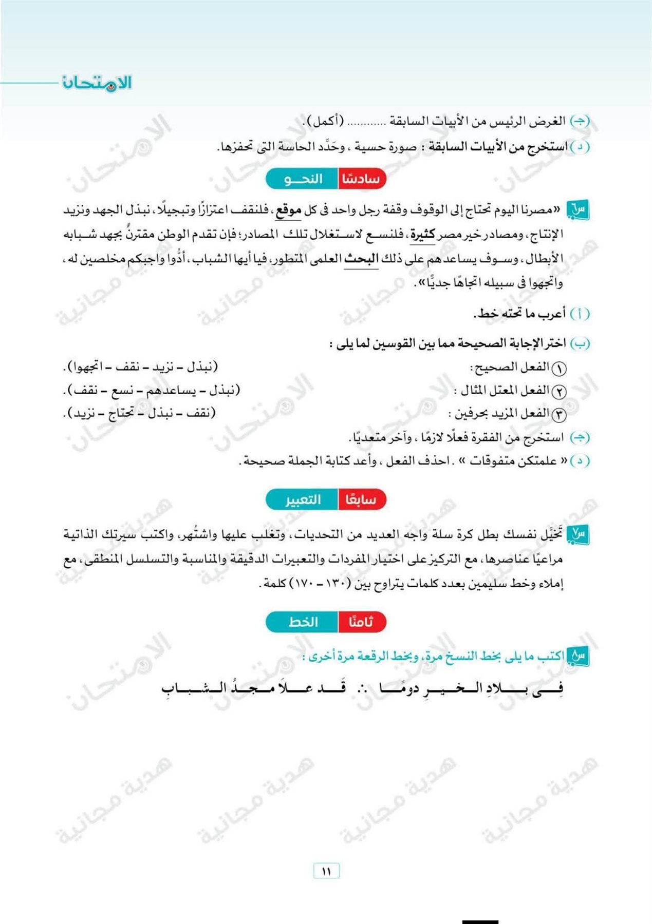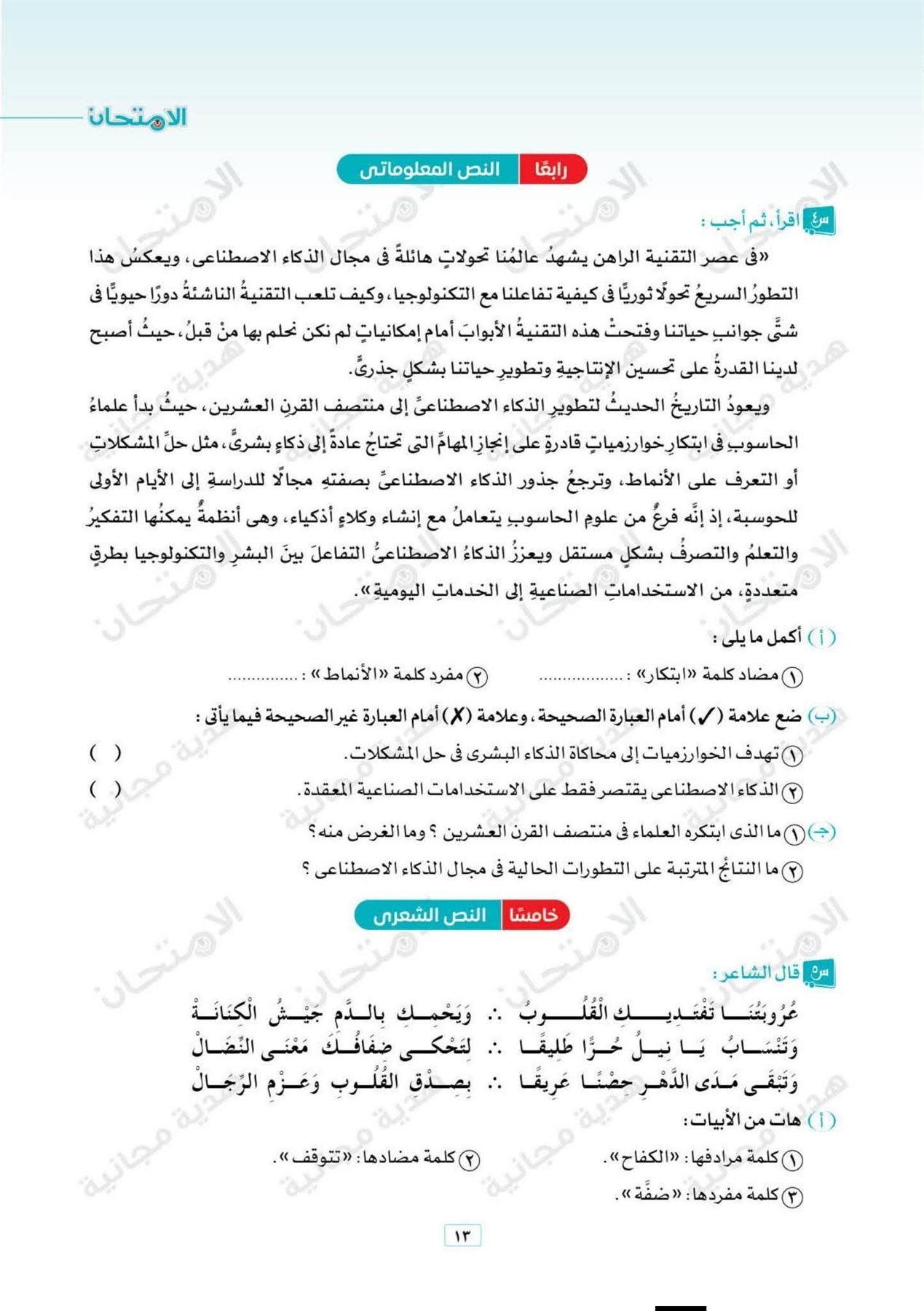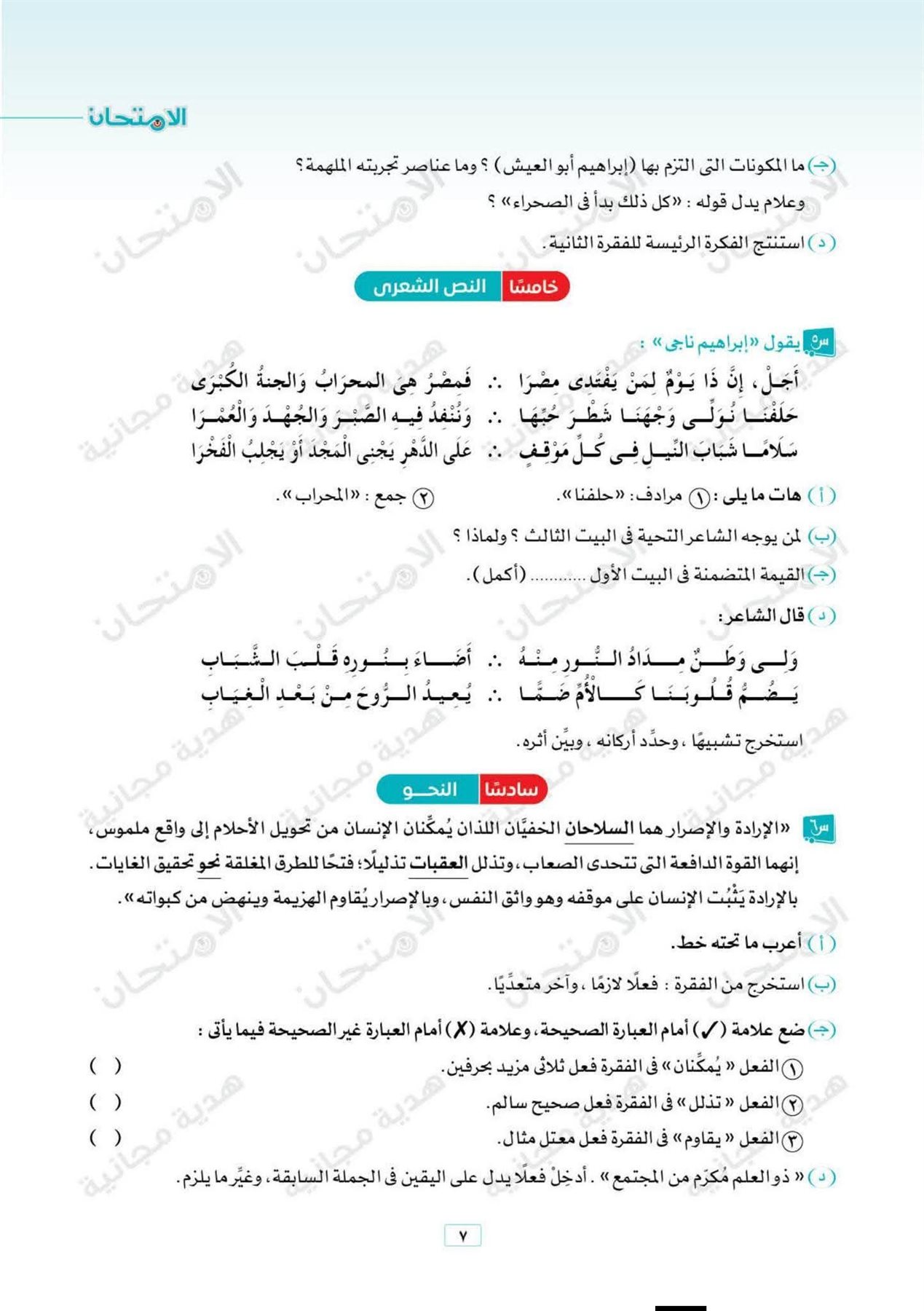 - نماذج امتحانات عربي الصف الأول الإعدادي محلولة