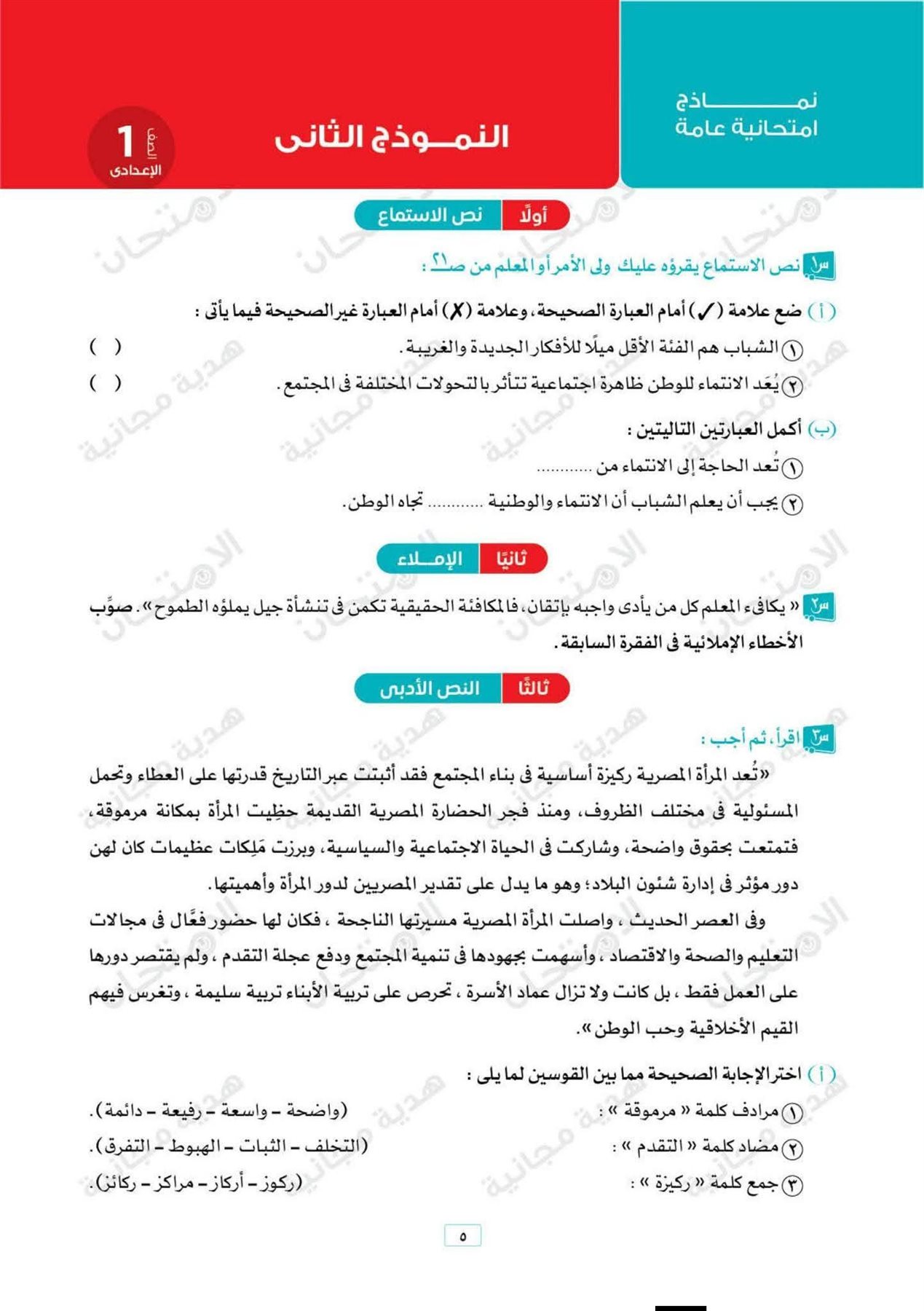 - نماذج امتحانات اللغة العربية أولى إعدادي ترم أول 2026