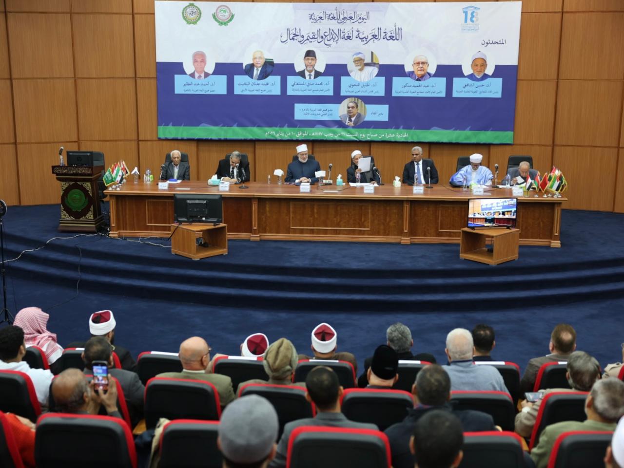 وأشار فضيلته إلى «المضحك المبكي» في إنشاء مجمع للغة العربية في الكيان الصهيوني، في الوقت الذي يتنكر فيه للعربية أهلها وتعوج عنها ألسنة أبنائها، لافتًا إلى أن من التحديات كذلك أننا لم نحسن تصور اللغة، ولم نتجاوز بها حفظ المتون، ولم نعمل على توجيه السليقة أو بناء الذائقة اللغوية التي ترى اللحن جريمة، وترى مخالفة البيان عجزًا، مؤكدًا أن هذا الواقع يفرض على الأمة إيجاد طرائق متنوعة لتجذير اللغة العربية في نفوس أجيال المستقبل، بدءًا من المدارس والمؤسسات التربوية، ومرورًا بوسائل الإعلام ووسائل التواصل الاجتماعي وغيرها من الأدوات المعاصرة.
