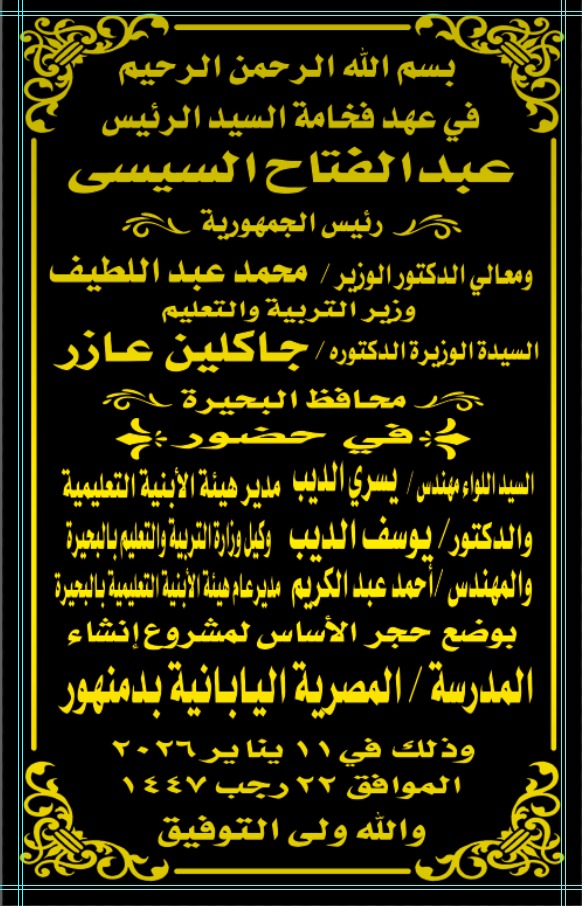 في إطار توجه الدولة نحو تطوير منظومة التعليم وبناء الإنسان المصري وفق أحدث النظم التعليمية العالمية، وضعت الدكتورة جاكلين عازر – محافظ البحيرة، صباح اليوم، حجر الأساس لإنشاء المدرسة المصرية اليابانية بمدينة دمنهور، والتي تُعد ثالث مدرسة من هذا النوع على أرض محافظة البحيرة.